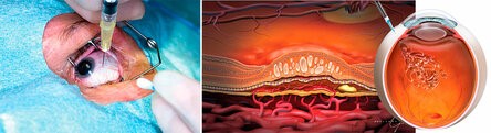 Золотым стандартом лечения влажной формы ВМД являются инъекции в глазное яблоко (так называемые интравитреальные инъекции) специальных лечебных препаратов (ингибиторов ангиогенеза, anti-VEGF препаратов). Стандарт лечения – 3 загрузочные инъекции, которые вводятся с интервалом в 1 месяц первые 3 месяца. В дальнейшем необходимость повторных инъекций решается в индивидуальном порядке согласно течению заболевания и ответной реакции со стороны сетчатки.